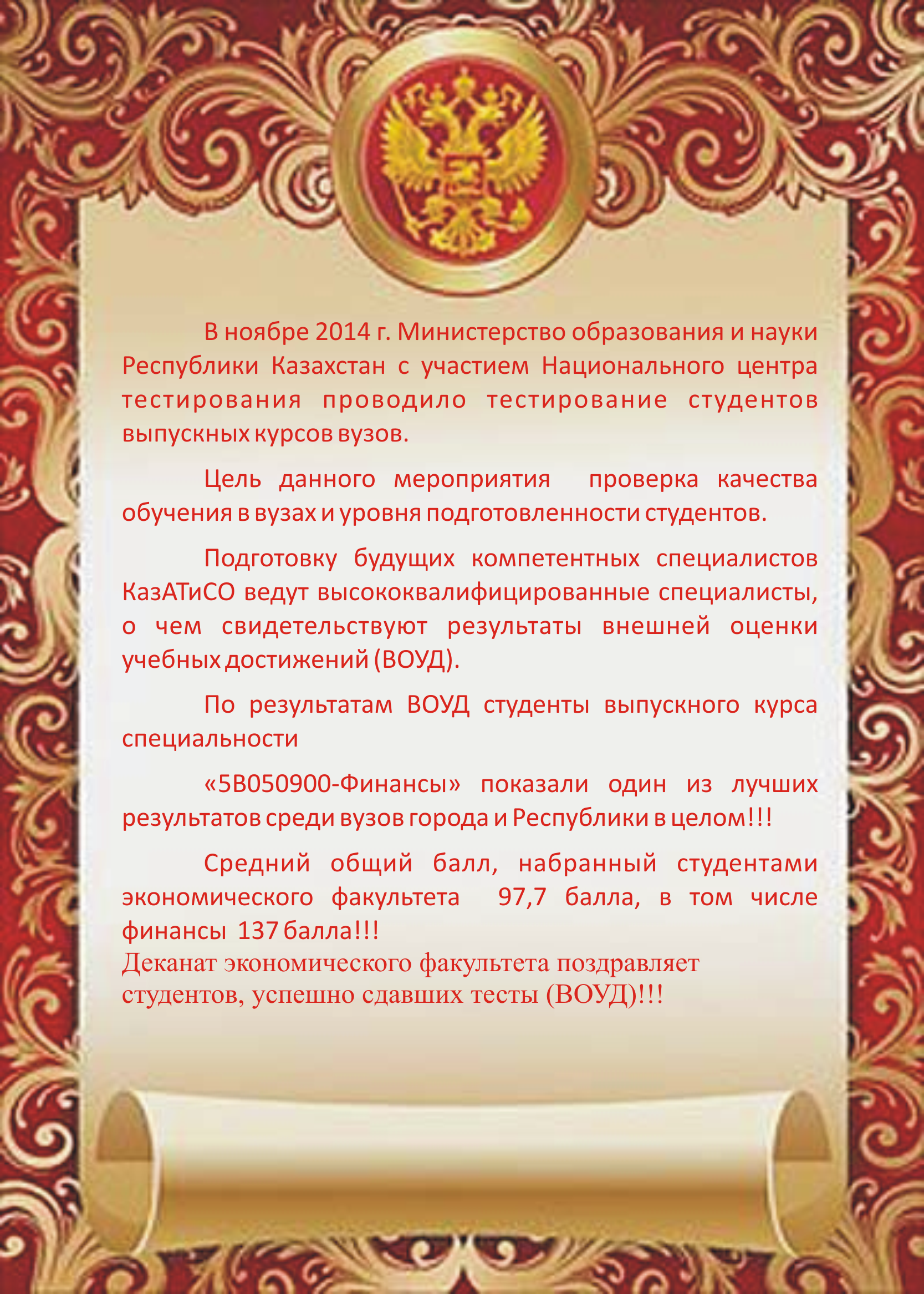 Особая благодарность студентам: Абдуллаевой Ж.Ж., Букреевой Л.С., Бердюгиной А.С., Гуляевой Г.А., Газизовой М.П., Гасановой Э.И., Власову Л., Байчурину Р., Долгоспиновой Т., Войнце К., Ляховскому О., Познякову А.В. за наиболее высокие результаты при тестировании, а также профессорско-преподавательскому составу: к.э.н., доценту Пармановой Р.С., к.э.н., доценту Калпакпаевой Ж.М. ,к.эн., доценту Саурыковой А.К. ст. преподавателю Большекбаевой К.О., ст. преподавателю Абдреевой Д.А., ст. преподавателю Демидовой Л.О., ст. преподавателю Кадыровой К.Ж., ст. преподавателю Елшибековой К.Ж. за организацию и ответственную подготовку к данному мероприятию.