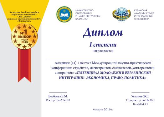 Учреждение «Казахская Академия труда и социальных отношений» (КазАТиСО) провела в рамках онлайн 4 марта 2016 г. в г. Алматы Международную научно-практическую конференцию студентов, магистрантов, соискателей, докторантов и аспирантов: «ПОТЕНЦИАЛ МОЛОДЕЖИ В ЕВРАЗИЙСКОЙ ИНТЕГРАЦИИ: – ЭКОНОМИКА, ПРАВО, ПОЛИТИКА».