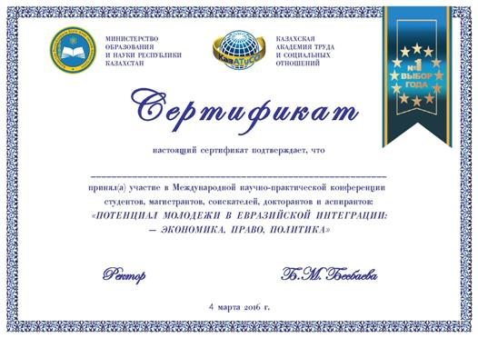 Международная научно-практическая конференция: «ПОТЕНЦИАЛ МОЛОДЕЖИ В ЕВРАЗИЙСКОЙ ИНТЕГРАЦИИ: – ЭКОНОМИКА, ПРАВО, ПОЛИТИКА»